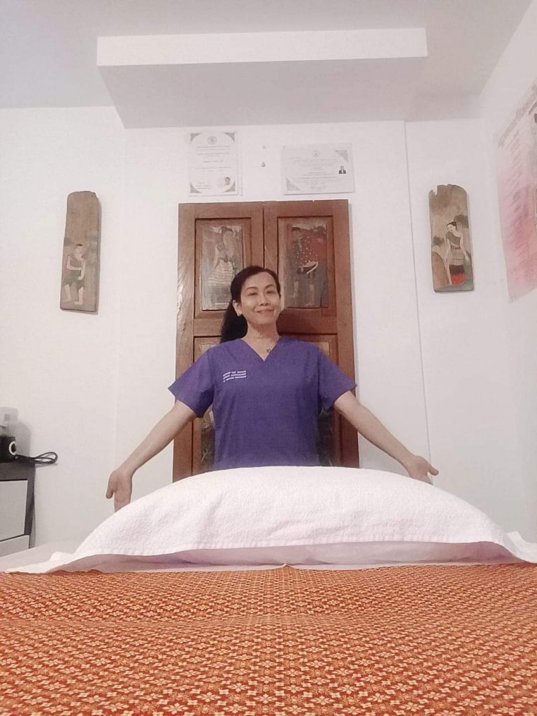 Mevrouw Lhin Khansaen is een gecertificeerde traditionele Thaise massagetherapeut, gespecialiseerd in aromatherapie (Noppadol School of Traditional Thai Medicine) en een gecertificeerd assistent in traditionele Thaise geneeskunde (Lanna Thai Massage School of Traditional Thai Medicine).